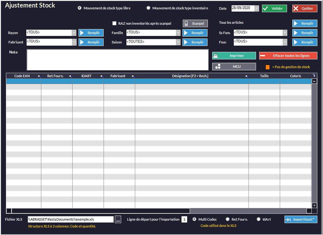 Cette case mettra à 0 tous les articles non inventoriés, c'est à dire tous ceux qui ne sont pas dans le tableau que vous venez de remplir avec le terminal inventaire. Soyez sûrs de ce que vous faites avant de la cocher car une correction a posteriori serait extrêmement fastidieuse.
