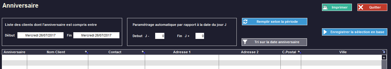 Agit sur les dates de gauche : vous permet d'ajuster par rapport à la date du jour (en plus ou/et en moins), pour savoir s'il y a des clients dont la date d'anniversaire est proche ou légèrement dépassée. Appuyez ensuite sur |