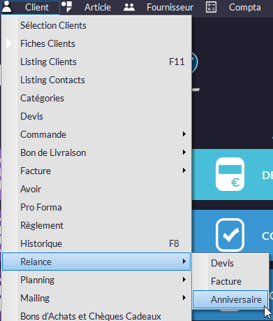 ☝Il faut avoir préalablement renseigné la date d'anniversaire du client dans sa fiche (onglet Compléments) !