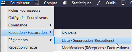 3. Menu Fournisseur -> Réception - Facturation -> Liste Suppression (Réceptions).