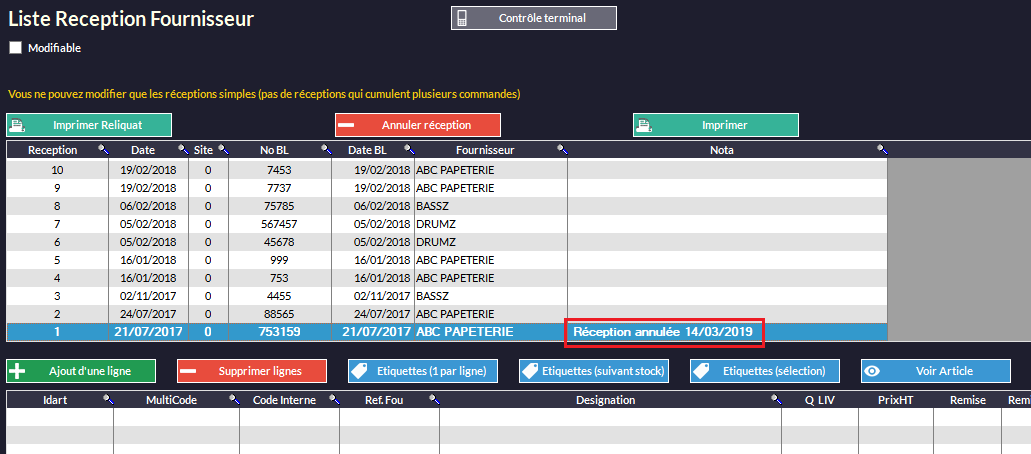Annulation d'une Réception [Fenêtre Liste Réceptions Fournisseurs] :