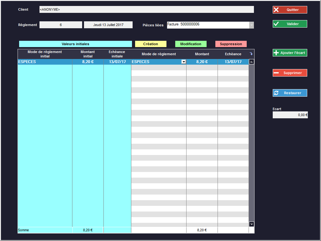 oType MAJ : règlement modifié (mode ou montant).