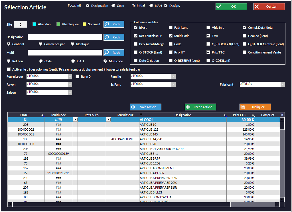 Il suffit de cliquer une fois sur l'article recherché dans la liste et d'appuyer sur Valider (ou cliquer + Entrée ou encore double-clic). Pour plus de détails sur cette fenêtre : Gestion des Articles - Création d'un article de base.