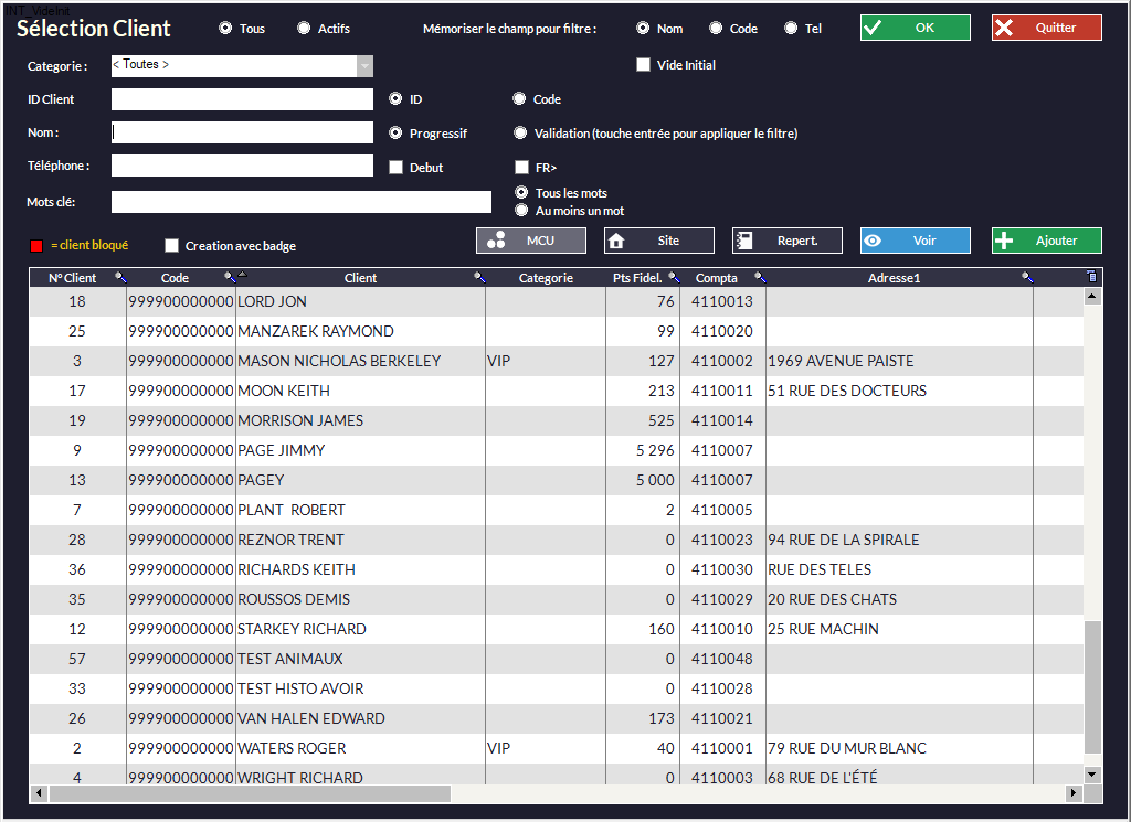 Il suffit de cliquer une fois sur le nom recherché dans la liste et d'appuyer sur Valider (ou cliquer + Entrée ou encore un double-clic). Pour plus de détails sur cette fenêtre : Gestion Clients - Création d'un Client et Gestion Clients - Création d'un Client - Liste des Fonctions.