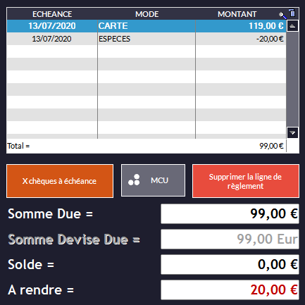 Dans cet exemple, le client achète un ou des articles dont le total fait 99€ (qu'il règle totalement en Carte). Il vous demande en plus 20€ en CashBack (les 20€ sont soustraits puisque l'argent sort de votre caisse). |