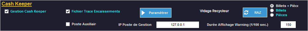 oLow Level Value : Valeur (en %) qui déclenche l'alerte "niveau bas" du CashKeeper. Ne pas mettre moins de 60.