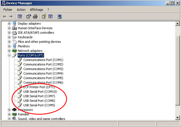 oAu redémarrage, vous pourrez contrôler dans le Gestionnaire de Périphériques la présence de 4 nouveaux ports de communications :