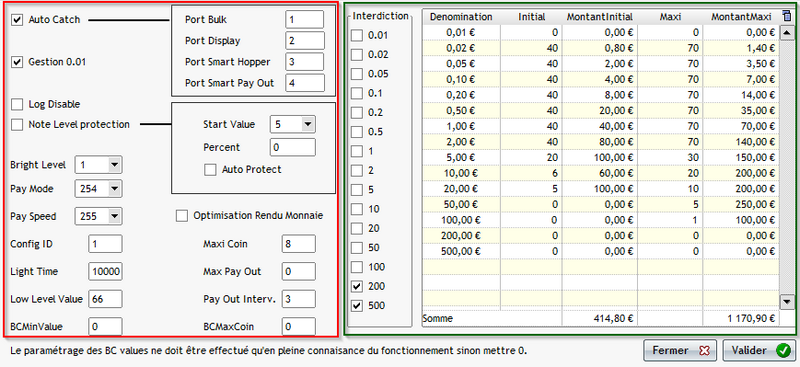 oBCMinValue et BCMAxCoin : Sert uniquement si la gestion des pièces de 1 cent n'est pas activée. Ces paramètres permettent d'augmenter la vitesse de rendu monnaie.