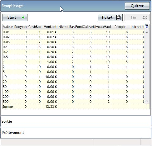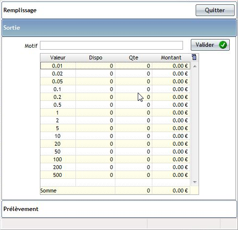 oCliquez sur Sortie puis sur la colonne Qte. Tapez les quantités correspondantes aux pièces et billets. Cliquez ensuite sur Valider. Le CashKeeper vous donnera les espèces demandées.