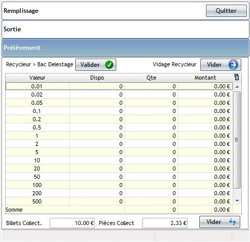 en bas à droite de la fenêtre. Il vous proposera le choix entre les les billets, les espèces ou tout. Vous pourrez alors prélever des cash box, les espèces collectées.