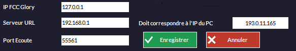Permet de configurer l'adresse IP du Glory, l'adresse (URL) de gestion et le port d'écoute.