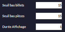Définit la durée d'affichage des alertes (niveaux bas des pièces et billets).