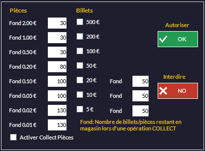 Détermine les niveaux de remplissage du Glory pour chaque dénomination (ainsi que le fond de caisse).