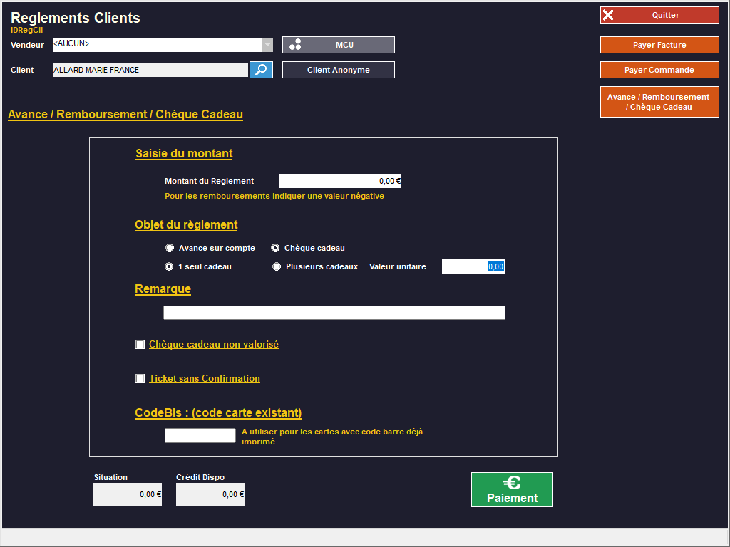 •Si vos chèques/cartes cadeaux sont pré-imprimés, vous pouvez scanner ou écrire le code-barres dans le champ Code Bis.