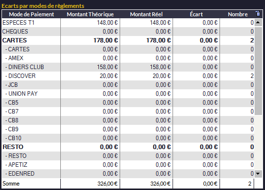 Notez que les modes en gras sont les totaux des modes additionnels listés en dessous. La procédure de clôture est la même, seule la présentation change pour vous permettre de vérifier en détails chaque mode de règlement. (v10C.0007) |