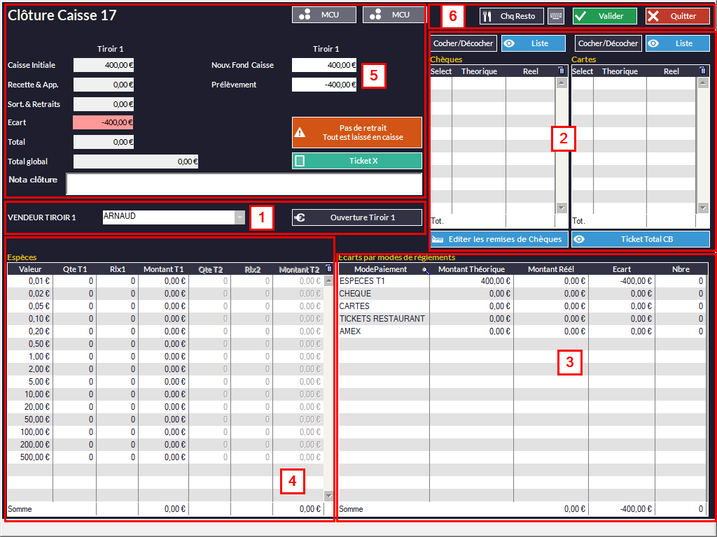 Il vous faudra vérifier les espèces du tiroir T2 de la même façon que pour le tiroir T1 (comme expliqué plus haut). Il s'agira d'une clôture globale.
