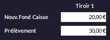 oD'autre part, la zone où vous allez définir le fonds de caisse pour le lendemain. Attention, la soustraction se fait toute seule ; par exemple, si vous avez 50€ et que vous mettez 20€ en fond de caisse, le champ Prélèvement passe automatiquement à 30€. La machine suppose que la différence Prélèvement - Fonds de caisse constitue ce que vous déposerez à la banque :