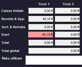 N.B : deux tiroirs peuvent être paramétrés pour un seule caisse (voir les chapitres Paramètres / Configuration - Ticket et Clôture Globale pour plus de détails) ils apparaîtront au moment de la clôture :