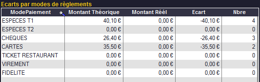 Ce tableau résume les données encaissées pour chaque mode de règlement. La deuxième colonne affiche les données théoriques, celles qui ont été saisies dans Kezia II. Tant que rien n'a été pointé dans le tableau 2, des écarts apparaissent (en effet, Montant Réel - Montant Théorique = Écart). Pointez vos encaissements et vérifiez qu'ils correspondent aux montants théoriques.