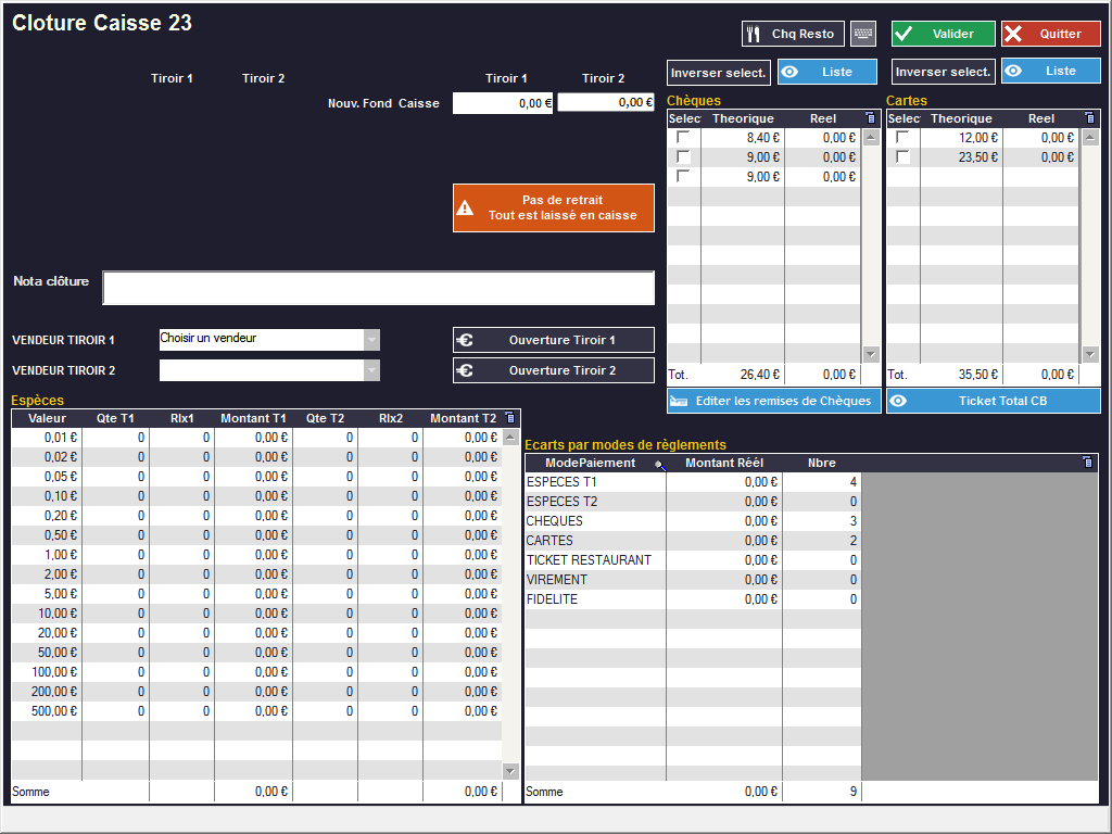 La procédure est la même que pour une clôture classique mais ici, le vendeur ne fait que saisir ce qu'il compte : en cochant les chèques et les cartes qu'il pointe et en remplissant directement la colonne Montant Réel pour les espèces).