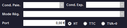 •Si vous avez préalablement créé des conditions particulières de paiement (voir dans Autres Fonctions - Fichier -> Paramètres -> Modes Règlement Paiement) et d'expédition (voir Autres Fonctions - Paramètres - Conditions d'Expédition) vous pouvez les choisir ici. Pour le mode de règlement, actionnez simplement le menu déroulant et choisissez.