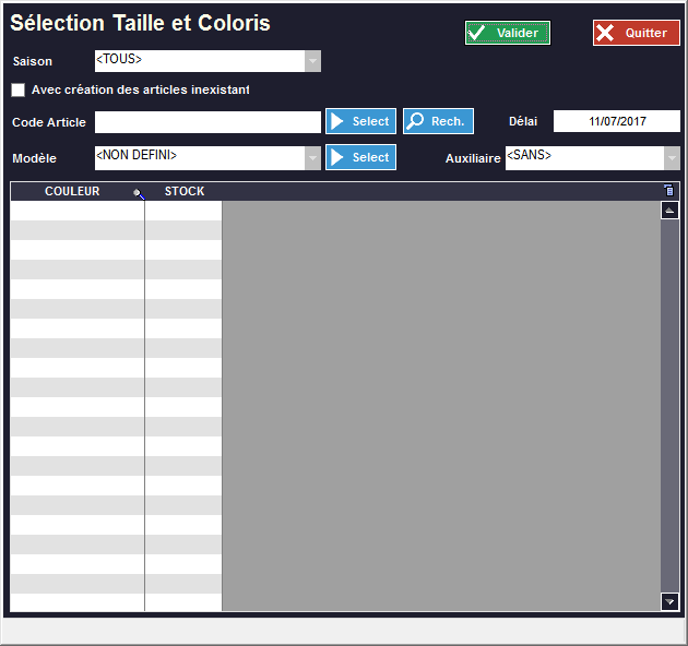 vous permet de remplir une commande avec vos modèles (n'apparaît que si la gestion des tailles/coloris est activée dans Fichier -> Paramètres -> Configuration -> Client/Options Métiers/Fournisseurs) :