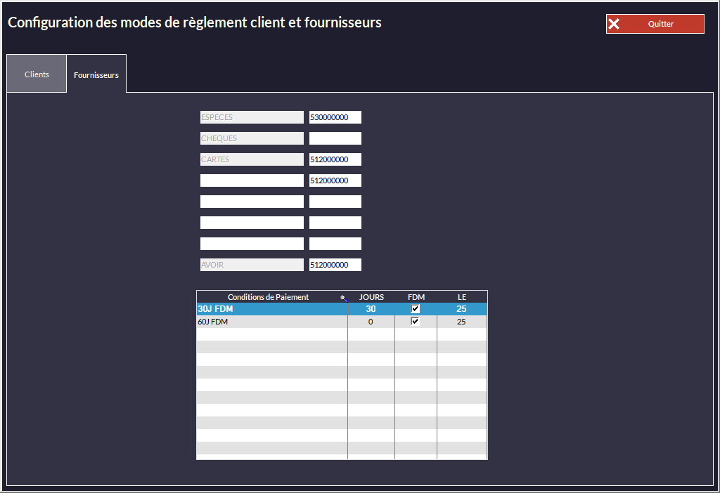 oEntrez les nouveaux modes de règlement personnalisés et leur code comptable pour les fournisseurs.