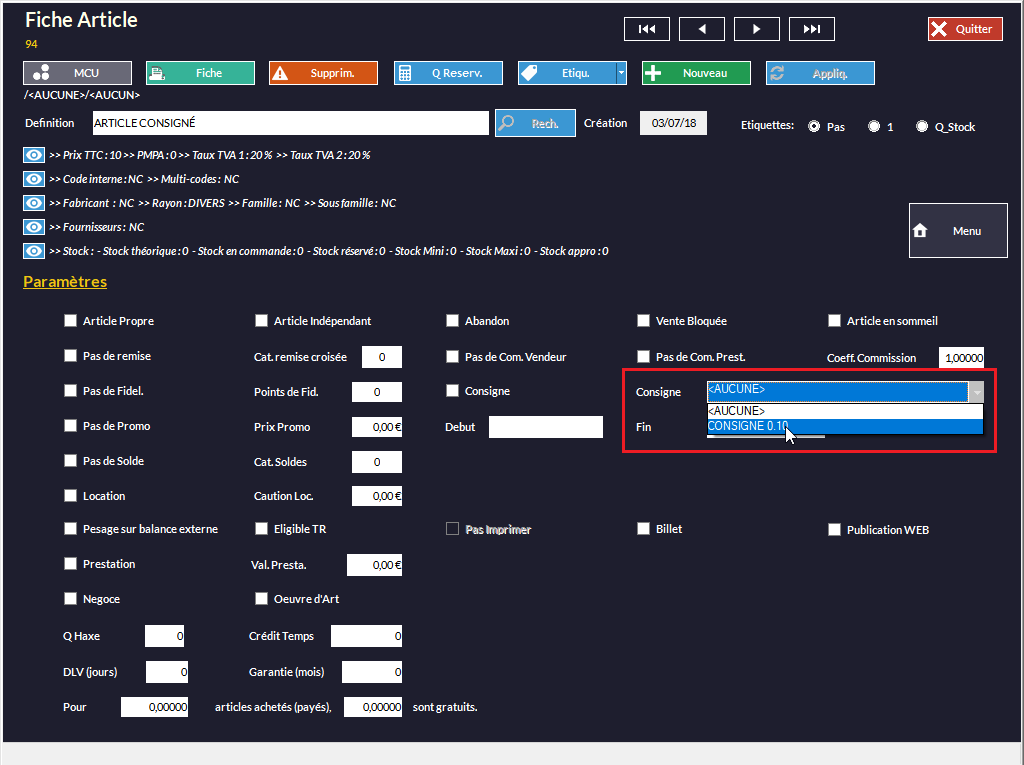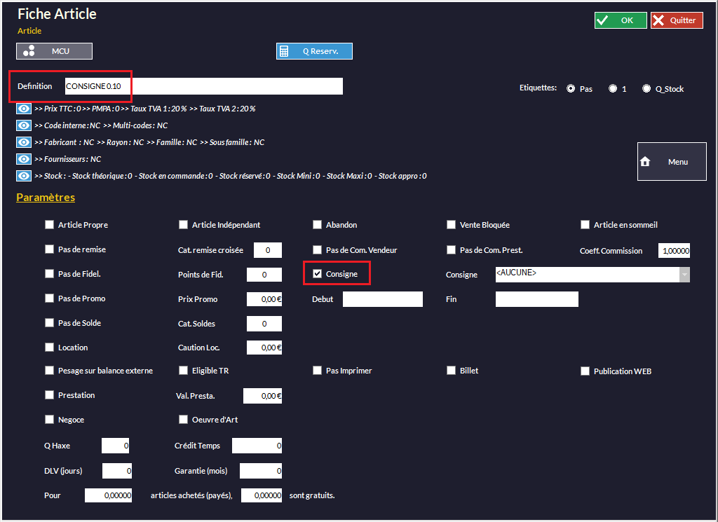 1.Créez un nouvel article que vous appellerez "Consigne" (avec éventuellement le prix de celle-ci dans la définition - utile si vous avez plusieurs consignes à différents prix) et cochez la case Consigne dans Menu -> Paramètres de la fiche article.