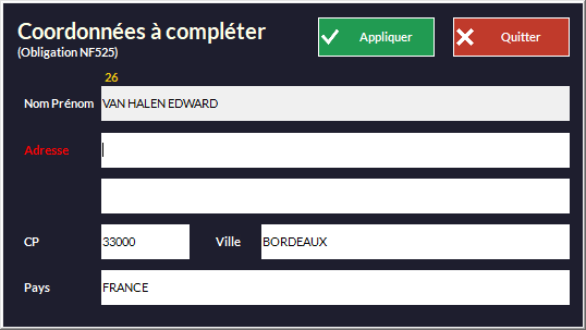 Saisissez les informations manquantes et validez. Ce sera ajouté dans la fiche client et dans le document que vous étiez en train de rédiger.