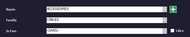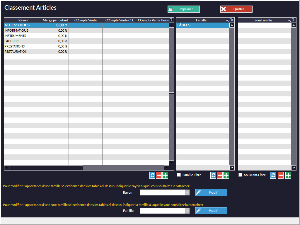 Par défaut, Rayon, Famille et Sous-Famille sont liés (une sous-famille est liée à sa famille et cette dernière l'est à son rayon). La case Libre vous permet de casser ce lien ; Sous-Famille et Famille deviennent libres.