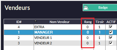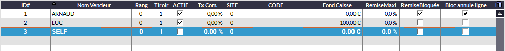 oACTIF permet de choisir s'il est actif ou non : le vendeur apparaîtra ou non dans la liste des vendeurs au démarrage du module caisse.
