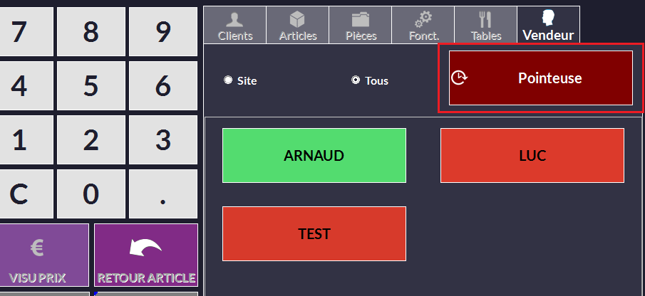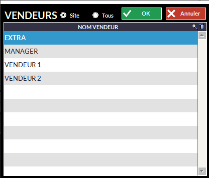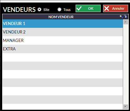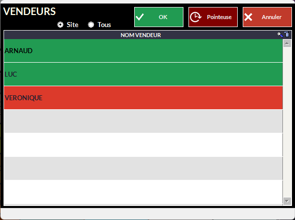 Lorsque la pointeuse est activée (voir La Vente - Gestion des Vendeurs - Pointeuse), la fenêtre de choix des vendeurs n'affichera que ceux qui ont pointé.