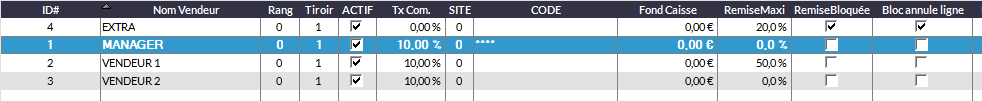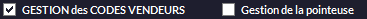 Active les mots de passes vendeurs. Lorsqu'en caisse, un nom de vendeur est choisi, un code est demandé. Cela suppose qu'un code ait été paramétré dans le tableau (colonne CODE, voir plus haut).
