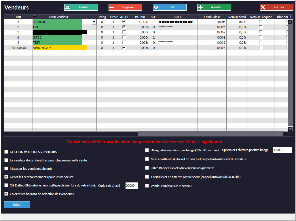 Restrictions Vendeurs : il faut avoir paramétré un code avant de les activer. Ainsi, le code du vendeur qui a le pouvoir sera demandé pour faire l'opération interdite.