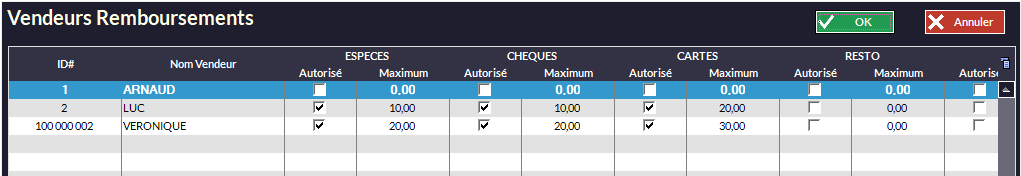 Vous pouvez pour chaque vendeur, définir un plafond de remboursement : un montant par mode de règlement :