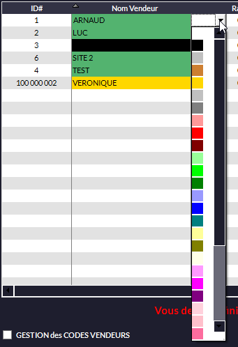 vous permet d'ajouter des couleurs pour identifier chaque vendeur. La couleur se retrouvera en caisse. Cliquez sur le menu déroulant pour la choisir (ici par exemple, jaune pour Véronique) :