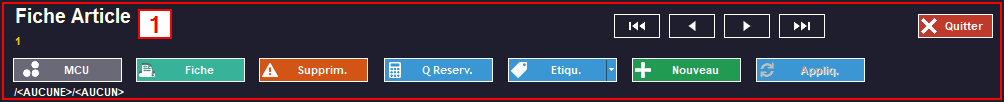 Le numéro en jaune (ici, 1) est l'identifiant unique de l'article (IDArt). Il ne peut y en avoir deux identiques, chaque fiche a un numéro unique. Vous retrouverez ce numéro dans des fenêtres de Kezia II. Vous aurez aussi la possibilité de rechercher des articles avec ce numéro.