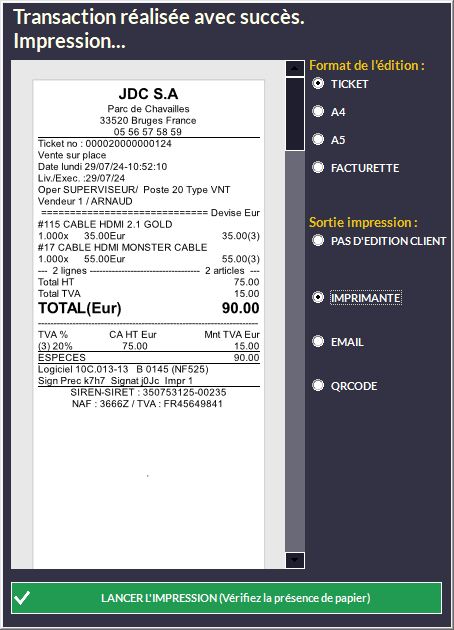 Pas d'impression Client sera cochée par défaut (plus d'impression ticket par défaut depuis le 1er août 2023) mais, à la demande du client, vous pourrez choisir un mode d'édition du ticket de caisse.