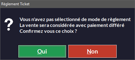 •Vous pouvez aussi différer le paiement en appuyant sur Valider sans sélectionner de mode de règlement. La facture est créée mais le client paiera plus tard. Le Logiciel vous demandera éventuellement une confirmation (attention, les options