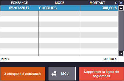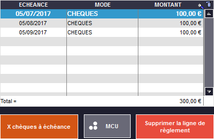 On peut aussi programmer un paiement en trois fois par exemple. Imaginons un client qui prenne un produit à 300€ et qui souhaite payer en 3 chèques. Vous pouvez appuyer sur la touche Chèques, le tableau va se remplir comme s'il payait les 300€ d'un coup :