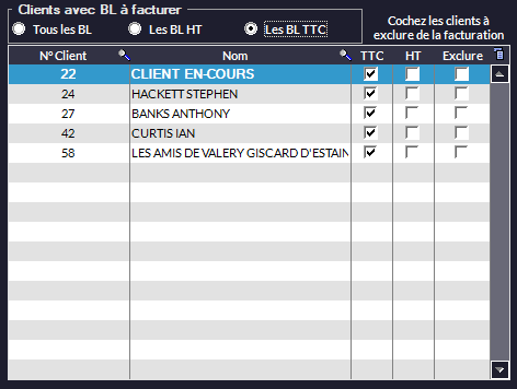 ▪Vous pouvez aussi facturer uniquement les BL d'un client pour la période donnée. Dans le tableau, le tri se fera sur le client sélectionné.