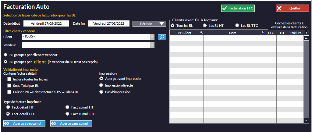 oVous pouvez visualiser un tableau dans lequel on peut voir les lignes des BL pour le client sélectionné. Vous pouvez ainsi voir la facture avant de la valider. Vous avez le choix entre un aperçu avec cumul