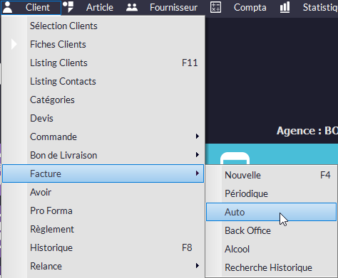 •Ensuite, lorsqu'il revient à la fin du mois/quinzaine/semaine pour payer, vous pourrez facturer tous ses BL dans le menu Client -> Facture -> Auto :