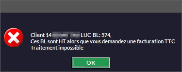 Attention : vous ne pourrez pas facturer des BL HT et TTC en même temps, le logiciel vous avertira :