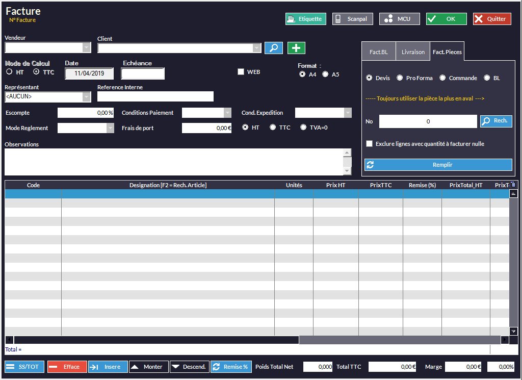 •* Si un devis/commande/BL/pro forma ne précède pas la facture, vous pouvez remplir directement le tableau avec vos articles en mettant les codes si vous les connaissez, en les bipant ou bien les cherchant avec la touche F2.
