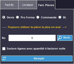 Vous pouvez taper directement le numéro du devis/pro forma/commande/BL et appuyer sur Remplir. Les lignes du devis/pro forma/commande/BL s'afficheront automatiquement.
