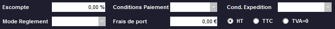 •Si vous avez créé des conditions particulières de paiement (voir dans Autres Fonctions - Paramètres - Modes Règlement Paiement) et d'expédition (voir Autres Fonctions - Paramètres - Conditions d'Expédition) vous pouvez les choisir ici. Pour le mode de règlement, actionnez simplement le menu déroulant et choisissez.