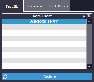 Dans l'onglet Fact. BL, sélectionnez le nom du client puis cliquez sur Facture. Les lignes du BL remplissent automatiquement le tableau. |