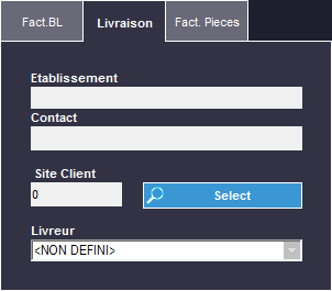 Dans l'onglet Livraison vous pouvez ajouter un contact et/ou un établissement pour la livraison. Il faut préalablement avoir choisi un client dans le menu déroulant correspondant. Contact, Établissement et Site Client se gèrent dans l'onglet Sites de la Fiche Client (voir La Vente - Gestion de Clients). L'idée c'est qu'un client peut avoir plusieurs sites et établissements. L'onglet Livraison permet de le préciser. Vous pouvez choisir aussi le livreur. |