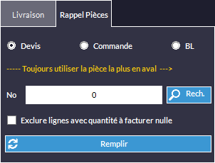 Vous pouvez taper directement le numéro du devis/commande/BL et appuyer sur Remplir. Les lignes du devis/commande/BL s'afficheront automatiquement.
